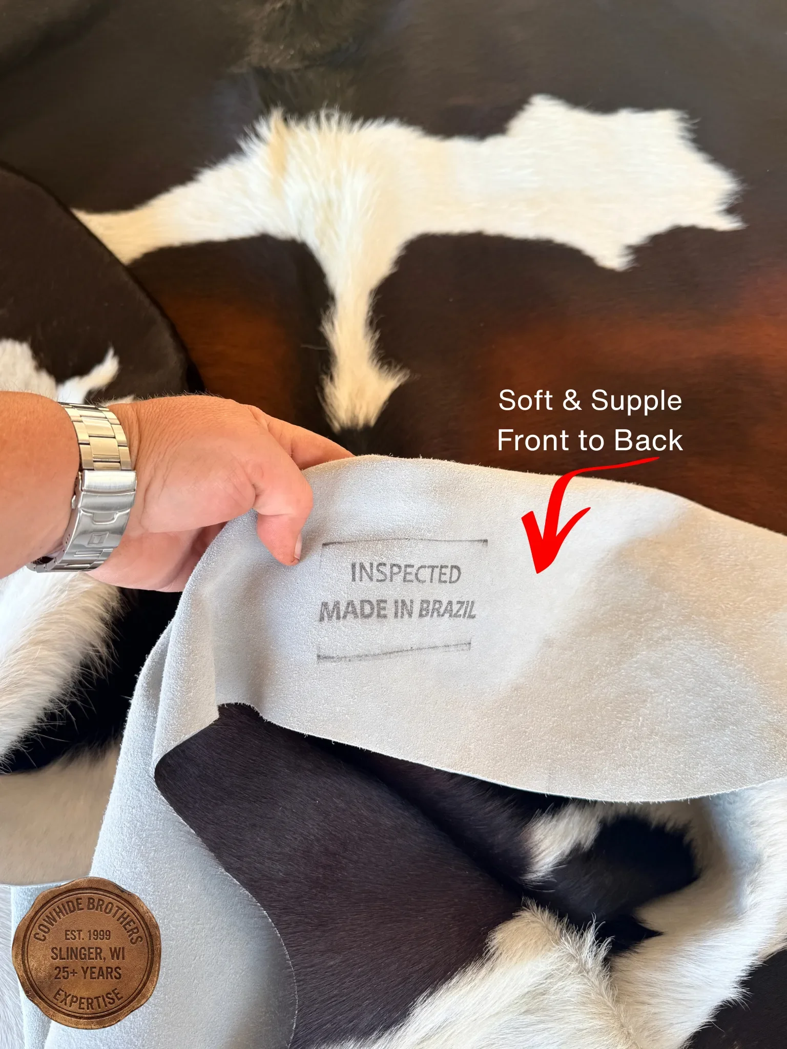 Is the Back Soft:One of the clearest signs of a premium rug is the back side. On a high-quality hide, the underside is soft, supple, and moves with the rug. On a cheaper or poorly processed hide, the back feels stiff almost like sandpaper. If the back is rigid, it won't lay flat and will eventually become brittle. These cowhides are one solid piece of leather, the back is part of the leather.